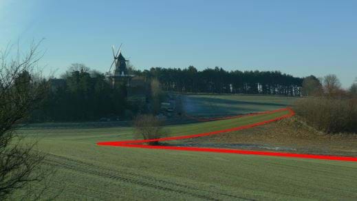 Langs markskel kan der eventuelt anlægges stier (trampestier, grusstier m.v.), som fører ud i det åbne land og hen til spændende kulturhistoriske monumenter (her en mølle).