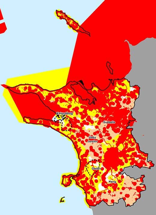 Kort 8.11.b Planmæssige bindinger for placering af større fælles biogasanlæg. Rød: restriktive zoner, orange: vurderingszoner anden myndighed, gul: vurderingszone kommunen.