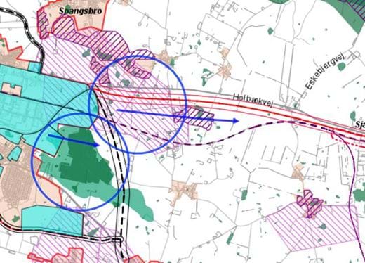 Kommunen er opmærksom på, at der fremadrettet kan blive behov for yderligere erhvervsudlæg, i form af større sammenhængende områder med plads til tungere miljøklasser. Derfor har kommunen overvejet perspektiverne for den fremtidige udvikling, særligt mod øst fra Kalundborg by og nord for Svebølle. På nedenstående kort er angivet potentielle perspektivområder og udviklingsretninger. Udpegningerne giver på dette grundlag ikke afsæt for en nærmere planlægning.